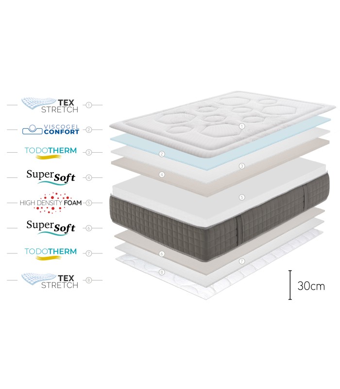 The composition of this mattress includes a 8 cm thick multilayer system composed of Gel viscoelastic, SuperSoft Foam and natural BIO MEMORY antiallergic fibers.