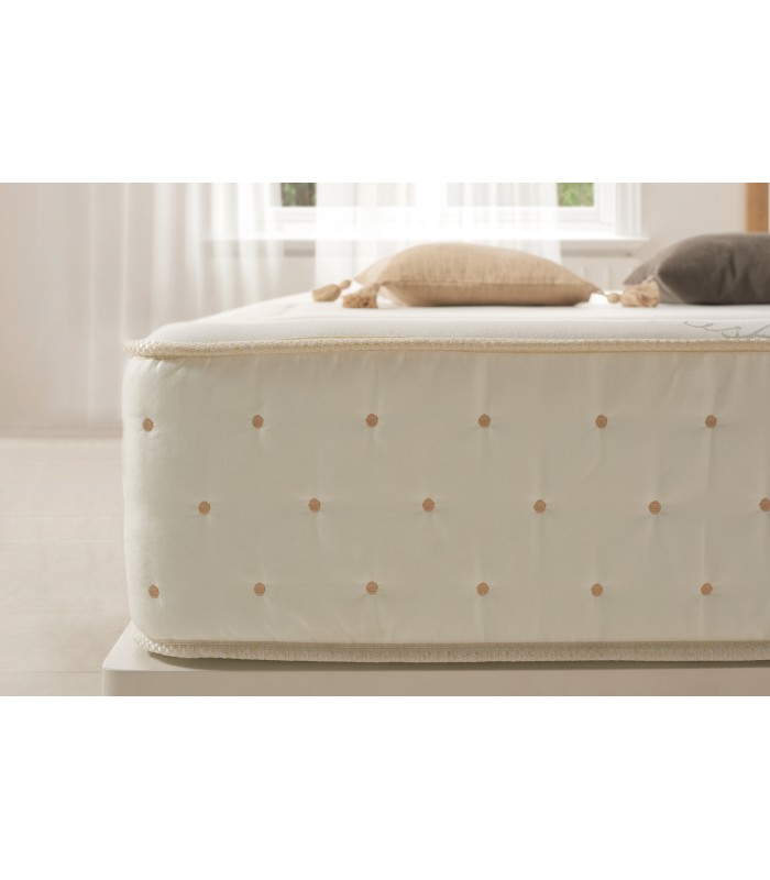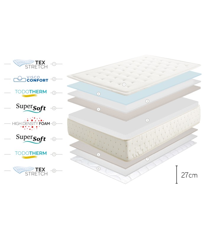Grosor: +/- 27 cm Viscoelástica + Supersoft + Fibras Biotherm: 5 cm Pression Care System: 12 zonas de descanso Firmeza Duo System H2-H3: Firmeza Cara A media y Firmeza Cara B Alta Sistema Sanitized antihongos, antiácaros y antibacterias para un descanso higiénico Anti alérgico, anti estático, electro biológico y anatómico Perímetro reforzado, cosido especial de seguridad para una mejor compactibilidad Independencia total de lechos Totalmente antiestático Anatómico y ergonómico Sistema AirSense :Confortable y Adaptable Tejido Stretch 3D Larga durabilidad Sistema de calidad OEKO-TEX® Certificación Europea Certificado CETEM 100% garantía de satisfacción Garantía 5 años Fabricado en España