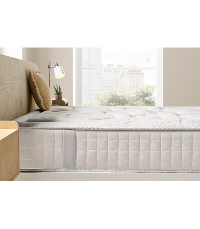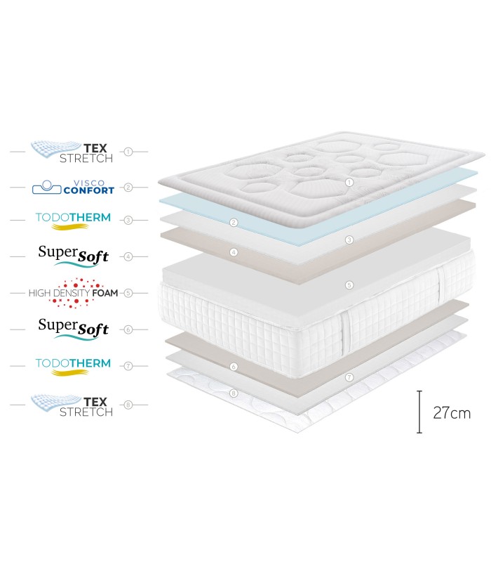 Grosor: +/- 27 cm Viscoelástica + Supersoft + Fibras Biotherm: 5 cm Pression Care System: 12 zonas de descanso Firmeza Duo System H2-H3: Firmeza Cara A media y Firmeza Cara B Alta Sistema Sanitized antihongos, antiácaros y antibacterias para un descanso higiénico Anti alérgico, anti estático, electro biológico y anatómico Perímetro reforzado, cosido especial de seguridad para una mejor compactibilidad Independencia total de lechos Totalmente antiestático Anatómico y ergonómico Sistema AirSense :Confortable y Adaptable Tejido Stretch 3D Larga durabilidad Sistema de calidad Certificaciones y garantías OEKO-TEX® Certificación Europea 100% garantía de satisfacción Garantía 5 años Fabricado en España