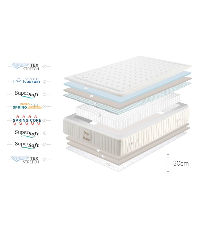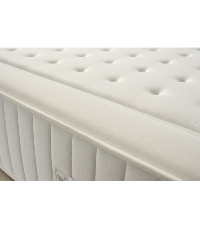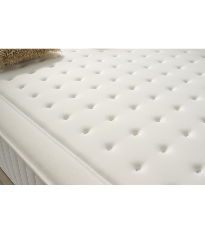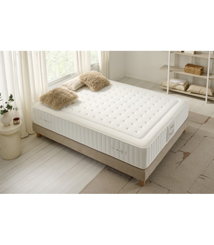 • Altura total: ± 30 cm • Capas superiores 5 cm de viscoelástica, espuma SuperSoft • Núcleo: Muelles ensacados independientes 220 muelles/m2 • Sistema de micromuelles ensacados independientes 240 muelles/m2 • Sistema Pressure Care Multizona: soporte personalizado en zonas clave • Anatómico, ergonómico e indeformable: con refuerzo lumbar • Columna en posición natural: especialmente recomendado para personas con dolencias lumbares o articulares • Transpiración mejorada: sistema antihumedad FlowSpring, termorregulable • Asas laterales: 4 unidades para fácil manipulación • Tratamiento higiénico: Sanitized® (antiácaros, antibacteriano y antialérgico) • Durabilidad: hasta 10 años • Garantías y certificaciones: o Certificación OEKO-TEX® o Certificación Europea o 100% satisfacción garantizada